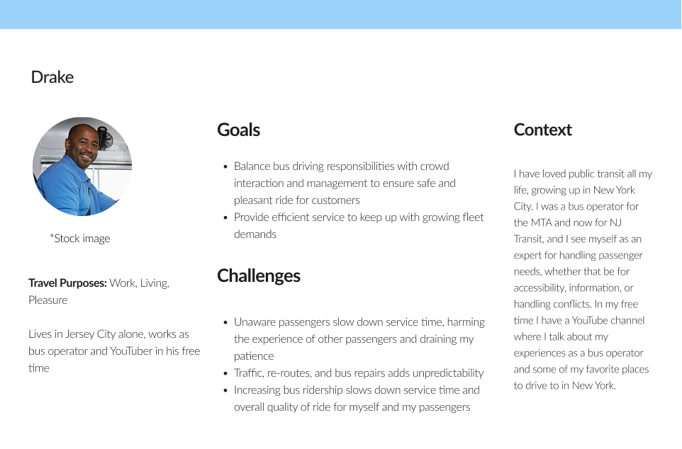 8 1-on-1 semi-structured interviews consisting of 5 users (NJ and NYC residents); 3 partners/subject matter experts (bus operators, NJ transit administrators) identified operator performance as a crucial yet often unspoken aspect of the ride experience. As technology moves shared transportation increasingly towards autonomy, the experience must continue to support these social requirements.