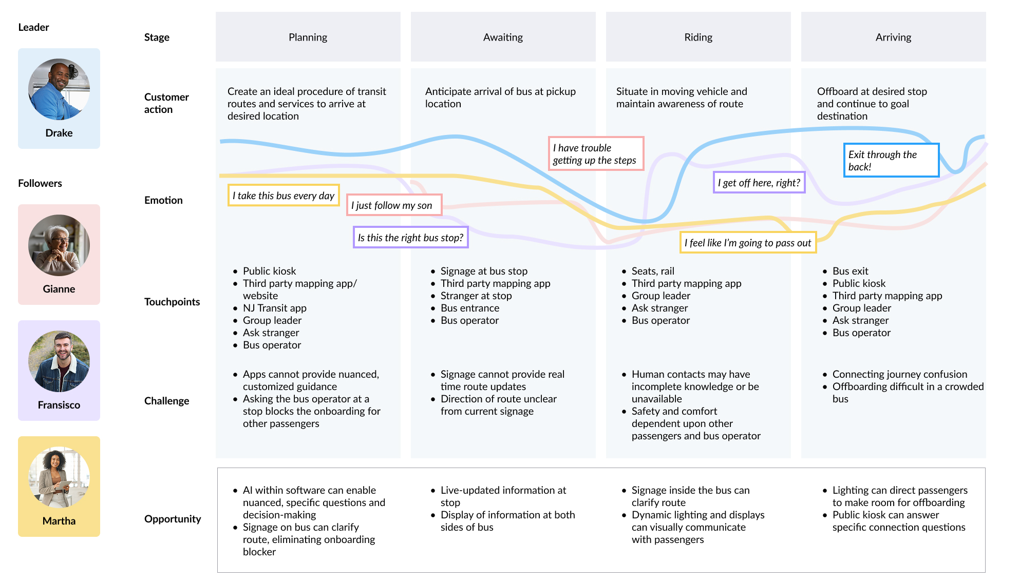 With a focus on the bus driver touchpoints, I created an in depth analysis of the user journey, identifying 4 major user personas, to identify opportunity areas to improve the experience.